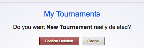 The tournament is sent to the archive. In the archive you can still view the tournament and its results. If you want to delete the tournament from the archive, click the Open archive button and then click the cross next to the tournament. On top of the page you’ll be asked if you really want to delete the tournament. Check the name of the tournament and click Confirm Deletion to finally delete the tournament. Click Cancel if you picked the wrong tournament or aren’t sure whether you really want to delete.