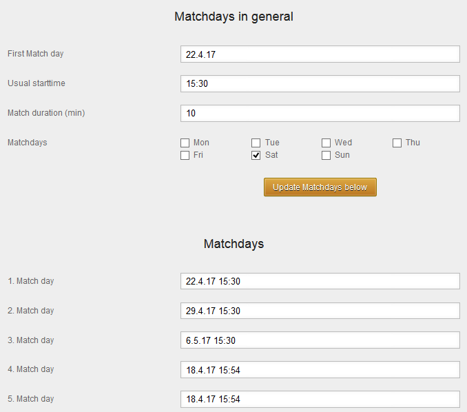 By clicking Refresh Matchdays the individual matchdays with their starting time will be worked out.