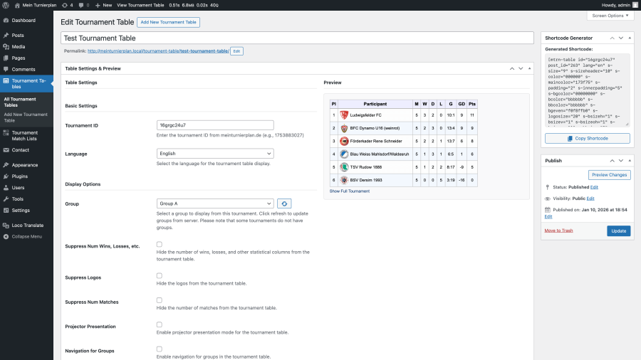 For WordPress users, we recommend our plugin for integrating tournament tables and match results. You can find it in the official WordPress directory under the name “MeinTurnierplan” or here: https://wordpress.org/plugins/meinturnierplan/